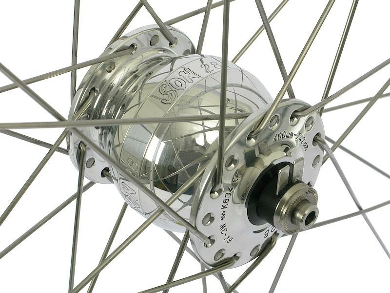 Der Son 28 ist ein universell für alle Laufradgrößen von 16″ bis 29″ zugelassener Nabendynamo. Die Nennleistung erreicht er im 28″ -Rad bei ca. 16 km/h. Damit ist er zu empfehlen, wenn bei langsamer Fahrt besonders viel Licht benötigt wird oder andere Geräte betrieben bzw. deren Akkus geladen werden sollen. Im Vergleich zum Vorgänger konnten die Leerlaufverluste um ca. 15 % und das Gewicht um 140 g verringert werden.